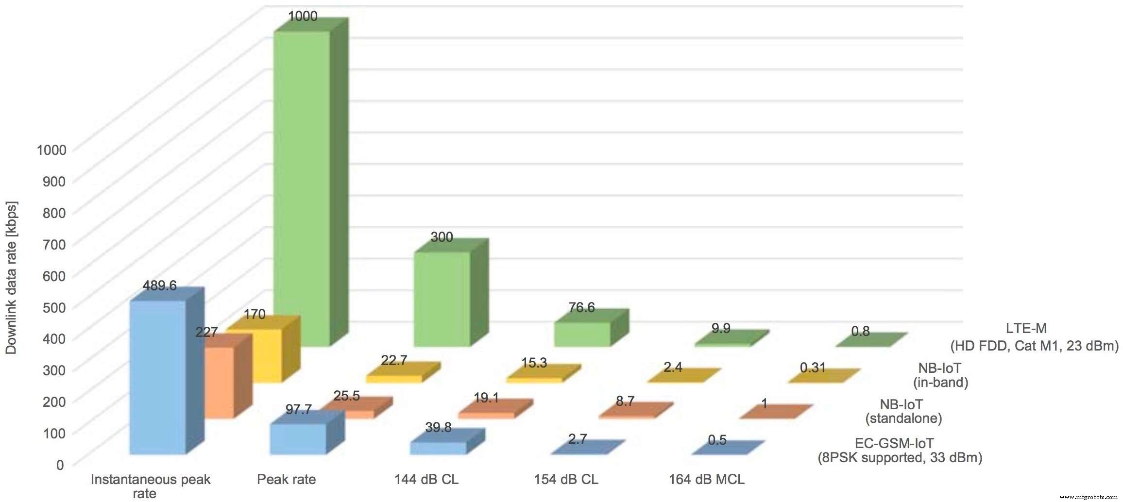 The uplink and downlink data rates for all CIoT technologies are summarized in Figures 9.7 and 9.8 across varying coupling losses. Each technology offers extended coverage up to a 164 dB coupling loss (MCL), a dramatic improvement over legacy GSM, UMTS, and LTE networks. EC‑GSM‑IoT achieves 164 dB with a 33 dBm transmit power—10 dB higher than the power required for NB‑IoT and LTE‑M to reach the same coverage.