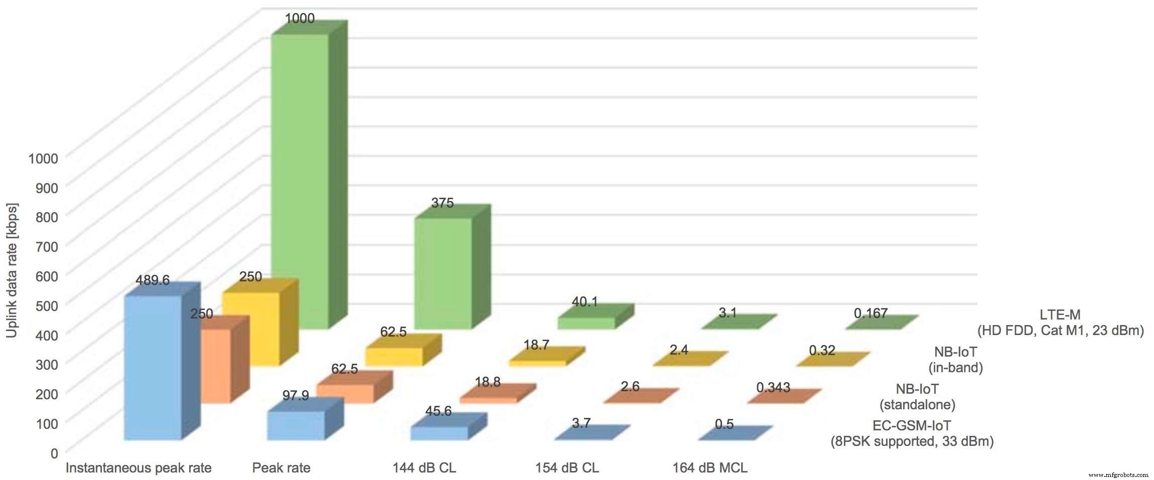 All three technologies satisfy the 3GPP requirement of 160 bps at a 164 dB MCL.