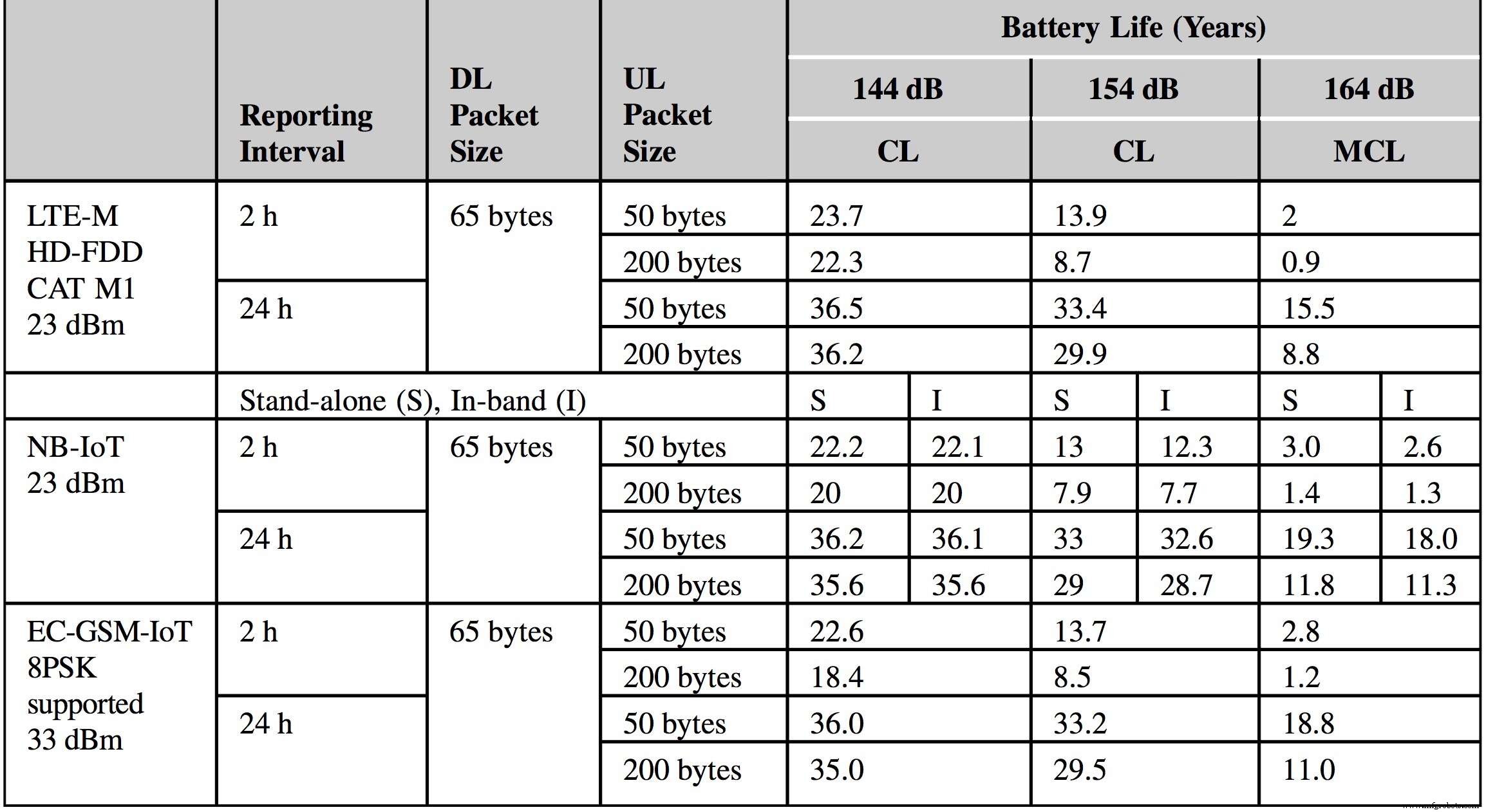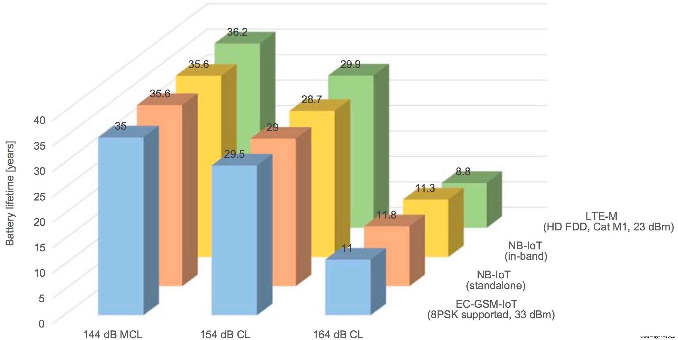 Figure 9.10 shows the lifetime for a daily 200‑byte report. Table 9.5 summarizes lifetimes across message sizes and periodicities. Each technology supports at least 10 years of battery life under typical conditions; in the worst‑case 164 dB MCL, 10‑year lifetimes are attainable only with daily transmissions. More frequent reporting (e.g., every 2 hours) reduces lifetime to 1–3 years at 164 dB.