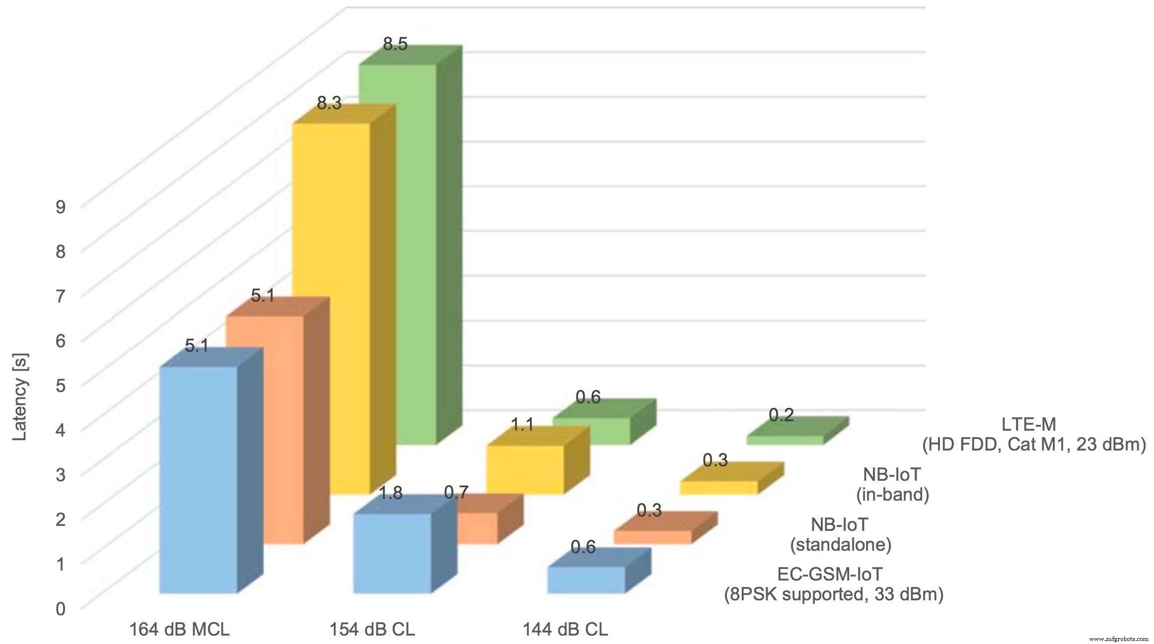 Latency was evaluated using an exception report—a high‑importance, infrequent message (85 bytes). All three technologies meet the 3GPP latency target of 10 s (Release 13). Within normal coverage, LTE‑M offers slightly lower latencies thanks to its higher data rates. In extended coverage, EC‑GSM‑IoT achieves the lowest latency because its higher transmit power yields higher data rates. Stand‑alone NB‑IoT also enjoys lower latency than in‑band NB‑IoT due to stronger downlink channels.